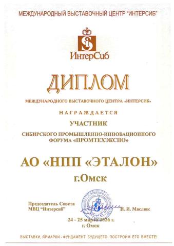 АО «НПП «Эталон» приняло участие в Сибирским промышленно-инновационным форуме «Промтехэкспо-2026» и награждено дипломом участика форума.